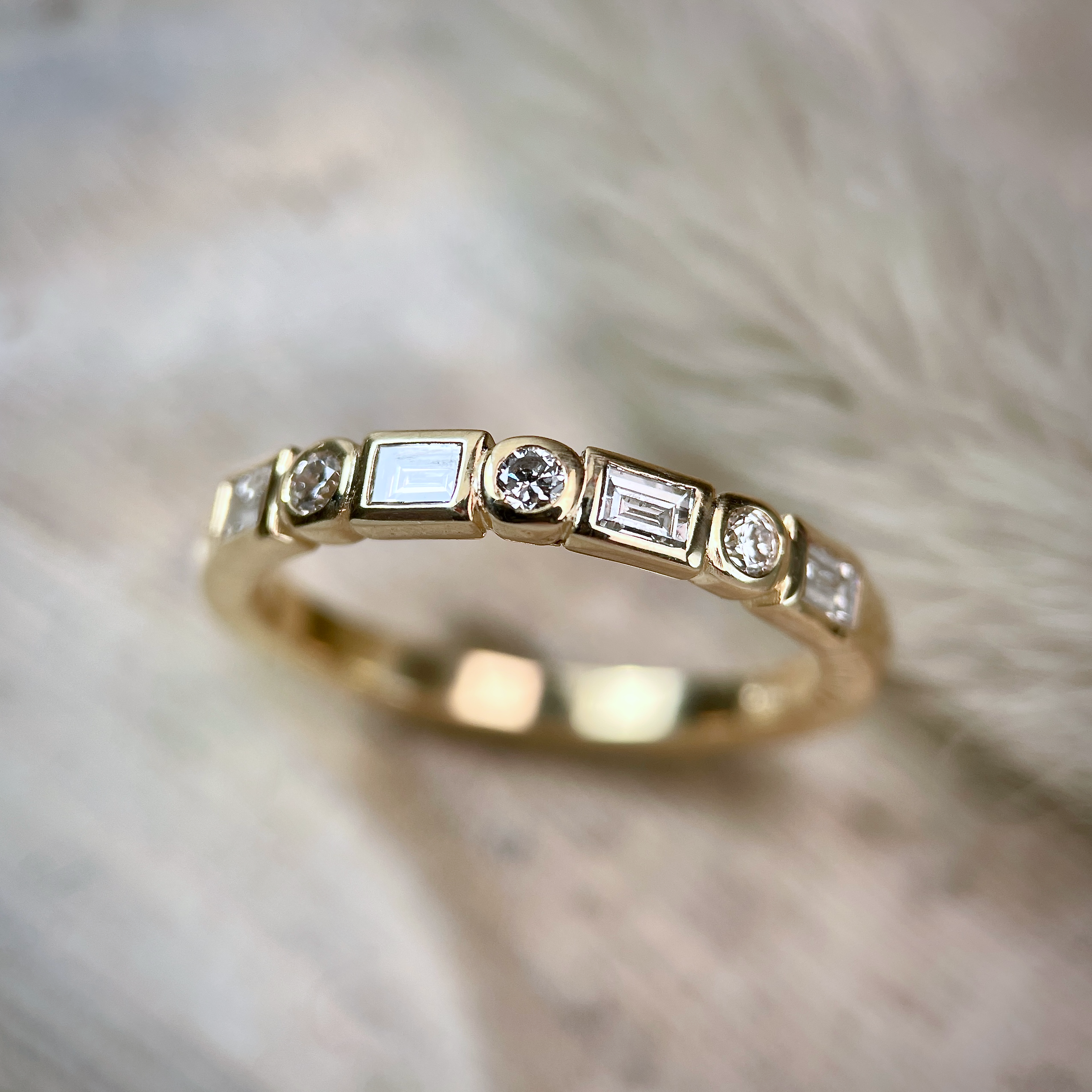 4=0.28ctw baguette diamonds and 4=0.15ctw round diamonds bezel set in 14k yellow gold band, size 6.5