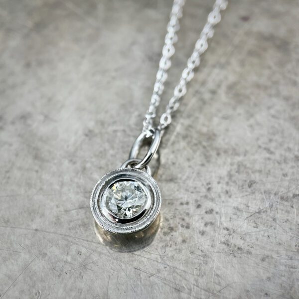 0.35ct diamond bezel set in a 14k white gold pendant with out signature fern finish and 18″ chain.