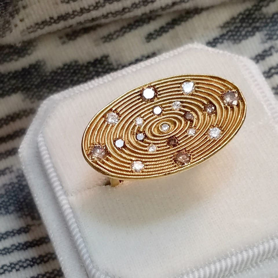 18k yellow gold, size 7.5, top diameter is 28x17mm, fern finish shank reverse tapers from 6.5-2.75mm, 0.71ctw Cognac diamonds and 0.34ctw round brilliant white diamonds, fern finish details, complimentary ring sizing.