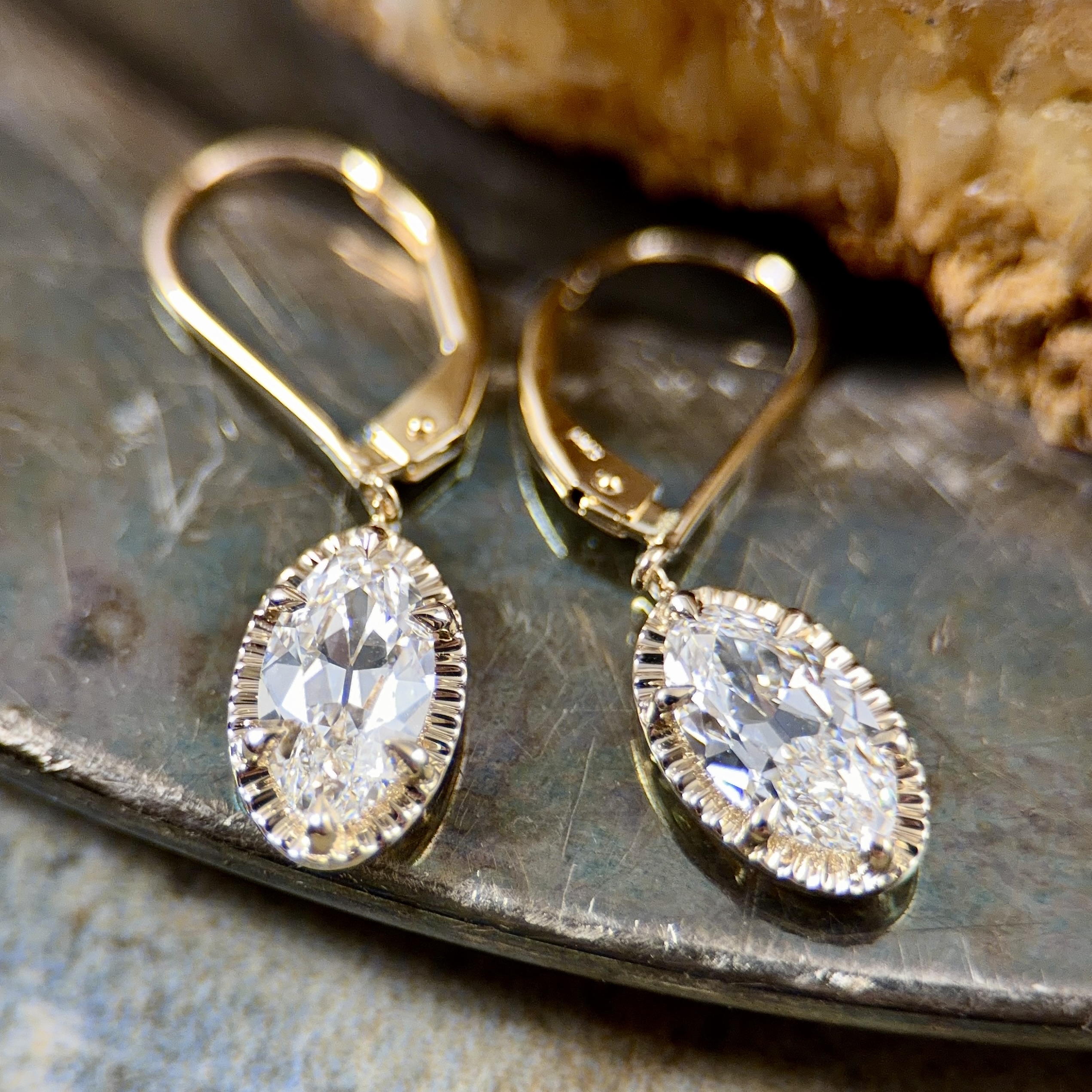 2=2.20ctw Moval cut lab grown diamonds set in 14k yellow gold with claw prongs, lever backs.