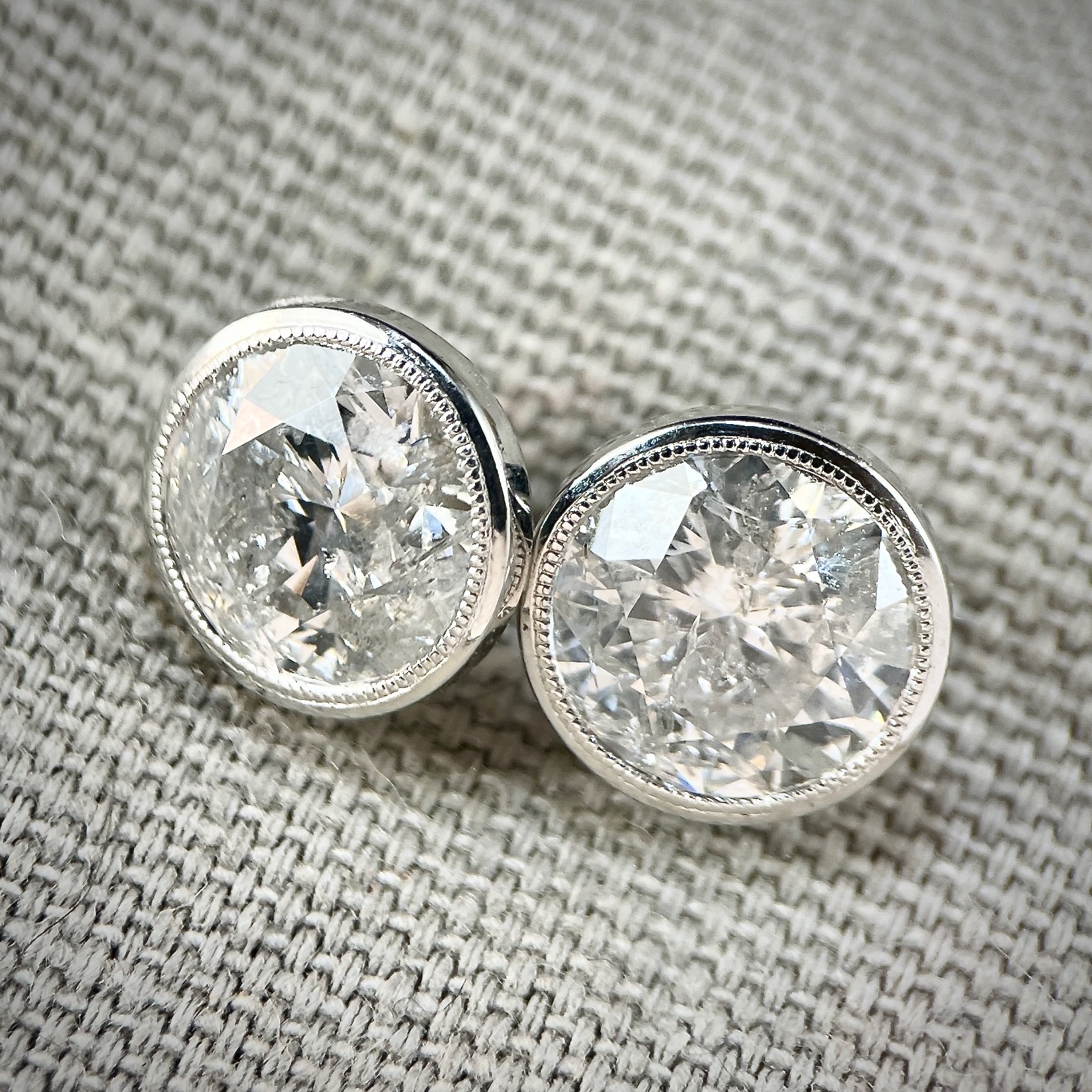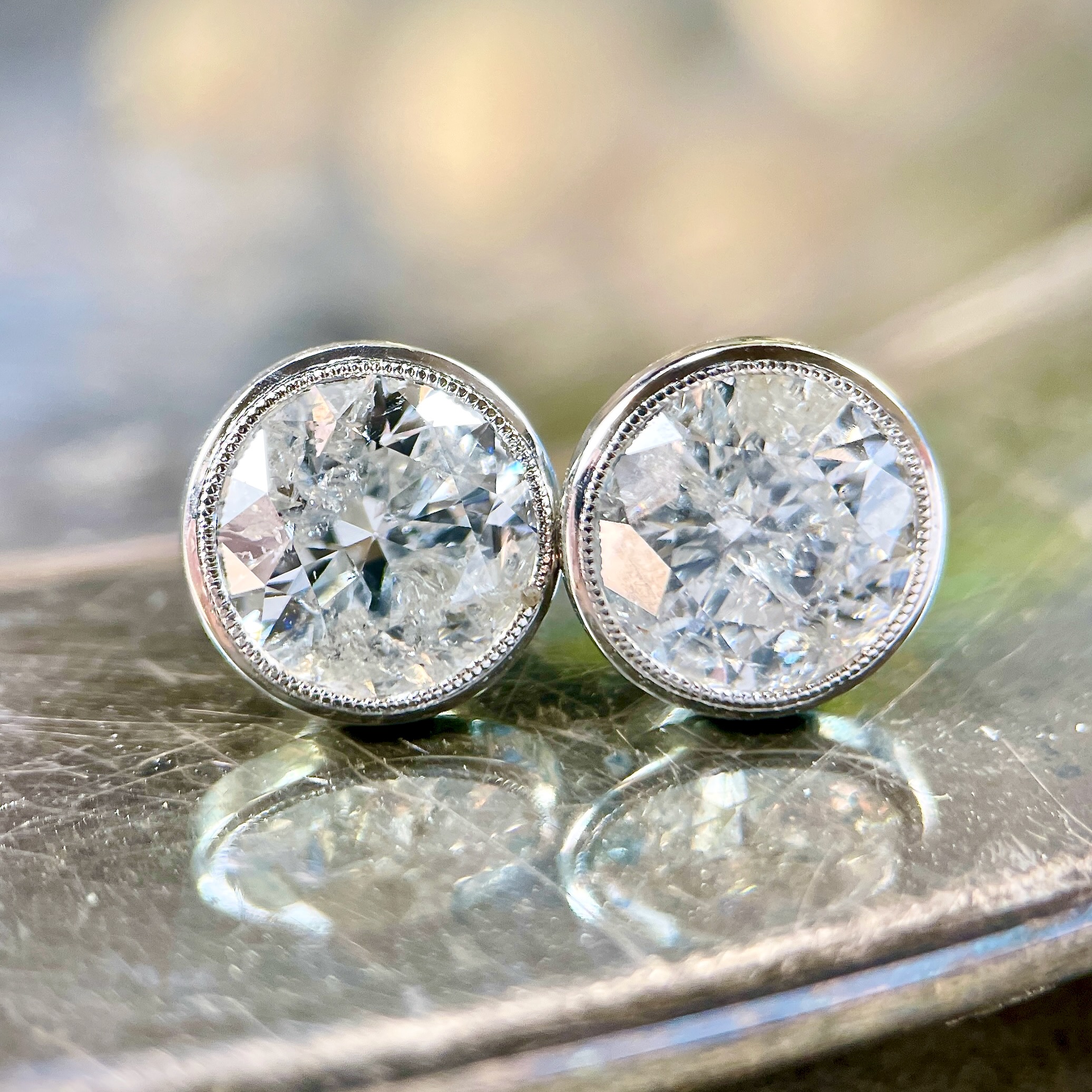 2= 3.10ctw Natural RBC diamonds F-G I1,  bezel set in platinum Martini style stud earrings.