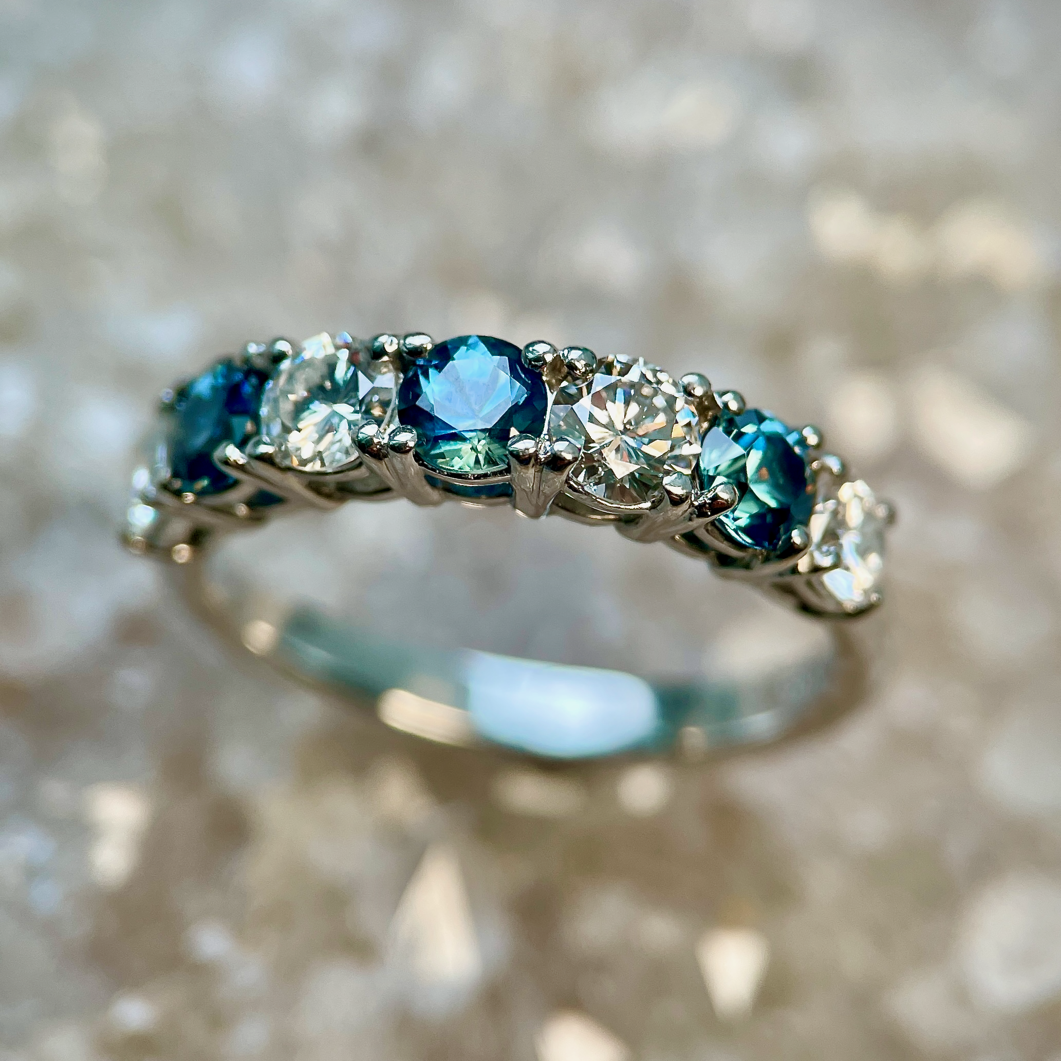 4=0.88ctw diamonds and 3=0.96ctw sapphires prong set in platinum band, size 8 with complimentary ring sizing.
