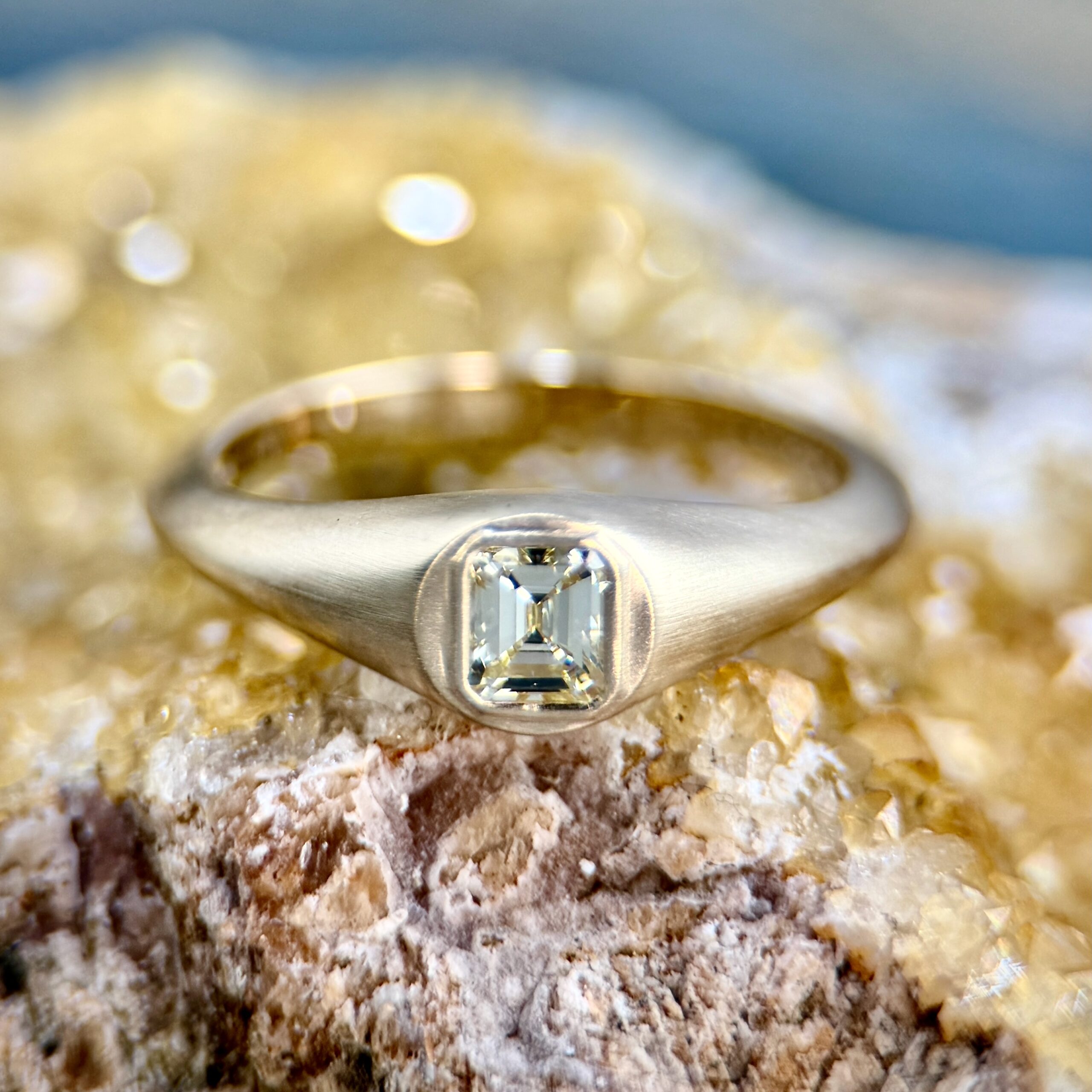 14k yellow gold signet pinky ring with 0.29ct Emerald cut fancy light yellow diamond. Size 5.75 with complimentary ring sizing.